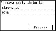 Če je nastavljen ID upravitelja sistema, je prikazan zaslon za prijavo za postopke, za katere potrebujete skrbniške pravice. Vnesite ID in PIN upravitelja sistema.
