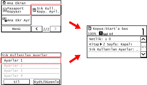 Hızlı işlem için kayıtlı ayarları [Ana Ekran] kısmındaki [Sık Kull. Kopy. Ayrl.] düğmesinden veya kopyalama işlevi ekranından çağırabilirsiniz. Ayrıca, ayarları gerektiği gibi çağırdıktan sonra da değiştirebilirsiniz.