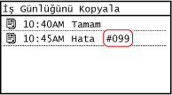 Yazdırma gerçekleştirilemiyor veya başka bir hata meydana geliyorsa iş günlüğünde bir hata kodu ("#" ile başlayan üç haneli bir sayı) görüntülenir.