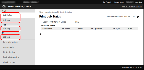 When you log in the Remote UI using the System Manager Mode or the Department ID, the status of all print jobs is displayed.