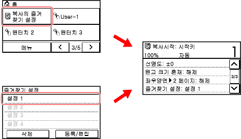 [홈] 화면의 [복사의 즐겨 찾기 설정] 버튼 또는 복사 기능 화면에서 등록된 설정을 호출하여 작업을 빠르게 수행할 수 있습니다. 설정을 호출한 후 필요에 따라 변경할 수도 있습니다.
