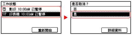 如果顯示工作清單畫面,請選擇要取消的工作,然後按下 [是]。
