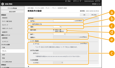 2 | 文書を留め置く条件を設定し、[OK]をクリックする ![]() [条件名]設定する条件の名称を入力します。一覧表示したときにわかりやすい名称を付けてください。 [条件を有効にする]条件を有効にする場合は、チェックマークを付けます。 [種類]条件の種類を次の中から選びます。