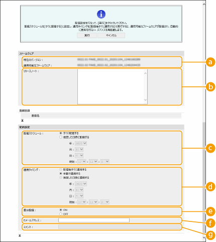 ファームウェアをすぐにダウンロードする場合は、[すぐに配信する]を選択します。決まった日時にファームウェアを自動的にダウンロードする場合は、[指定した日時に配信する]を選択し、日時([年 :]/[月 :]/[日 :]/[時刻 :])を指定します。スケジュールは1週間先まで指定できます。