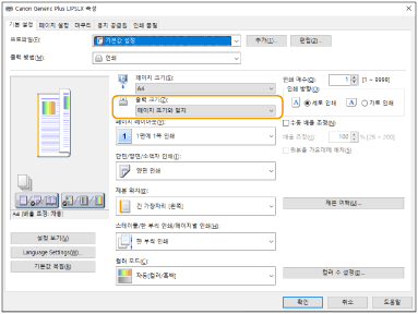 프린터 드라이버의 [출력 크기]와 인쇄할 용지의 크기를 맞춥니다.