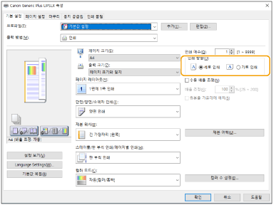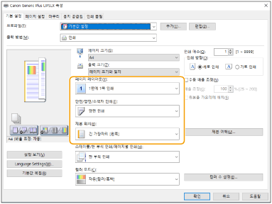 3 | 인쇄 미리 보기를 확인하는 동안 [페이지 레이아웃] [페이지 순서] [단면/양면/소책자 인쇄] [제본 위치]를 설정합니다. |