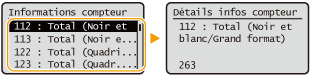 Pour plus d'informations sur <Service de contrôle>, contactez votre revendeur ou représentant de service. Vous pouvez imprimer une liste indiquant le nombre de pages utilisées pour l'impression. Imprimer rapport  <Rapport du compteur> Pour plus d'informations sur les conditions de comptage, contactez votre revendeur ou représentant de service. |
