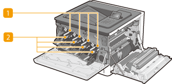 Austauschen der TrommelpatronenSetzen Sie die Tonerpatronen in diese Einschübe wie folgt ein: Y (Gelb) in den äußersten linken Einschub gefolgt von M (Magenta), C (Cyan) und K (Schwarz).