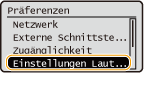 <Ton Schlafmodus> | Es ertönt ein Signalton sobald das Gerät in den Ruhemodus wechselt oder wenn das Gerät ausgeschaltet wird, wenn Sie <Einstellungen Schnellstart f. Hauptstrom> auf <Ein> einstellen (je nach Situation startet das Gerät nur langsam und der Signalton ertönt nicht). |