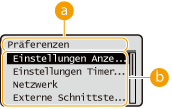 Einstellungselemente, die zur aktuellen Menüebene gehören, werden in einer Liste angezeigt.