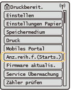 Wählen Sie <Anz.reih.f.(Starts.)>, um den Bildschirm <Startseite> durch Neuanordnung der Schaltflächen anzupassen. Anpassen des DisplaysSie können die Einstellungen im Bezug auf die Bildschirmanzeige ändern, wie beispielsweise der Bildschirm, der unmittelbar nach Einschalten des Geräts angezeigt wird, und ob die Meldung für verbleibende Papier- und Tonermenge erscheint. <Einstellungen Anzeige> |