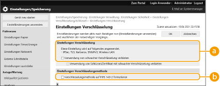 Wenn Sie [Verschlüsselungsmethode für FIPS 140-2 formatieren] wählen, erfolgt die TLS-Kommunikationsverschlüsselungsmethode gemäß den von der Regierung der Vereinigten Staaten genehmigten FIPS (Federal Information Processing Standards) 140-2, aber es gelten die folgenden Einschränkungen. Es tritt ein Fehler auf, wenn Sie versuchen, ein Zertifikat für TLS festzulegen, das einen Algorithmus verwendet, der nicht von FIPS (geringer als RSA2048bit) erkannt wird. Es tritt ein Kommunikationsfehler auf, wenn das Kommunikationsziel keine FIPS anerkannte Verschlüsselungsalgorithmen unterstützt. [CHACHA20-POLY1305] und [X25519] können nicht mehr verwendet werden. Stapelweises Importieren/stapelweises ExportierenDiese Einstellung lässt sich mit Modellen, die diesbezüglich den Stapelimport unterstützen, importieren/exportieren. Importieren/Exportieren von Einstellungsdaten Diese Einstellung ist beim Stapelexport in [Grundinformationen Einstellungen/Speicherung] enthalten. Importieren/Exportieren aller Einstellungen |