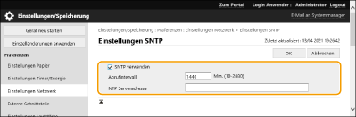 Mit dem Simple Network Time Protocol (SNTP) können Sie die Systemuhr mithilfe des Zeitservers im Netzwerk einstellen. Wenn SNTP verwendet wird, wird der Zeitserver in den angegebenen Intervallen überprüft; daher kann immer die korrekte Uhrzeit beibehalten werden. Die SNTP-Einstellungen können über die Remote UI festgelegt werden.