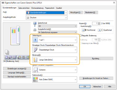 3 | Überprüfen Sie die Druckvorschau, und stellen Sie [Seitenlayout] [Seitenfolge] [Einseitiger Druck/Doppelseitiger Druck/Broschürendruck] [Bindung] ein. |