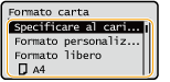 Se è necessario cambiare frequentemente la carta da caricare, impostare su <Formato libero>; ciò ridurrà il numero di passaggi necessari per modificare l’impostazione ogni volta. È inoltre possibile visualizzare un messaggio di errore quando l’impostazione nel driver della stampante è notevolmente diversa dal formato della carta caricata.