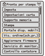 Selezionare <Vis. ordine(sch.pr.)> per personalizzare la schermata <Home> riordinando la disposizione dei pulsanti. Personalizzazione del displayÈ possibile modificare le impostazioni relative alla visualizzazione della schermata, come ad esempio quale schermata appare subito dopo l'accensione della macchina e la visualizzazione di un messaggio relativo alla quantità residua di carta e toner. <Impostazioni visualizzazione> |
