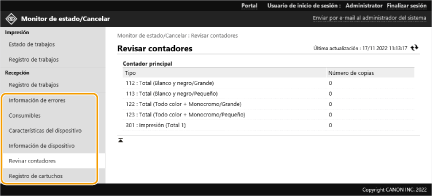 Puede consultar diversa información sobre el equipo, tal como información de errores, la cantidad de papel y de tóner restante, información sobre el equipamiento opcional conectado y el número total de páginas que se han impreso hasta el momento.