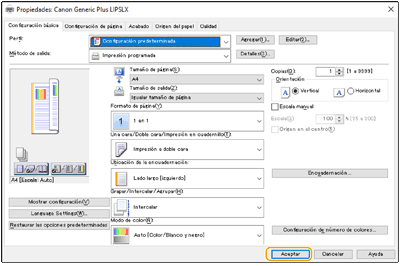 Especifique las opciones de impresión según sea necesario y haga clic en [Aceptar].