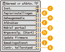 <Functie-instellingen>, <Voorkeuren> en vele andere machine-instellingen starten vanaf deze toets.