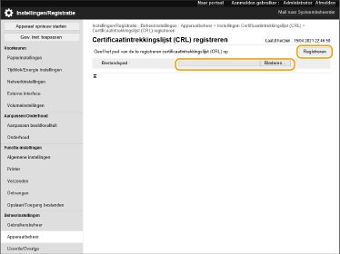 U kunt de Remote UI (UI op afstand) gebruiken om een certificaatintrekkingslijst (CRL) te registreren. Voor informatie over de CRL's die op de machine kunnen worden geregistreerd, raadpleegt u