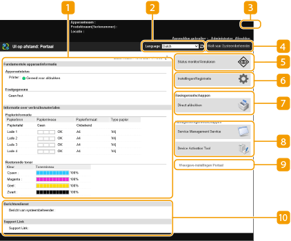 Sommige weergave-items en functies zijn alleen beschikbaar als u zich aanmeldt met beheerdersbevoegdheden. Als meerdere gebruikers de Remote UI (UI op afstand) gelijktijdig gebruiken of wanneer het bedieningspaneel van de machine tegelijk met de Remote UI (UI op afstand) wordt bediend, zal de laatste handeling die werd uitgevoerd, van kracht worden. |