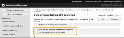 Selecteer dit selectievakje om afdrukopdrachten en zwart-wit afdrukopdrachten te accepteren van printerstuurprogramma's die geen ondersteuning bieden voor Afdeling ID beheer.