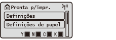 (Início). O ecrã <Início> ou o ecrã de definições aparece no visor, o que permite iniciar funções como <Suporte de memória> e <Portal Móvel>. Também pode utilizar o visor para verificar informações como, por exemplo, mensagens de erro e o estado de funcionamento da máquina.