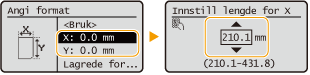 | Velg <X> eller <Y> for å angi lengden på hver side med de numeriske tastene eller  /  . |