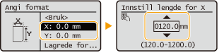 Spesifiser lengden på <X>-siden og <Y>-siden. Velg <X> eller <Y> for å angi lengden på hver side med de numeriske tastene eller
