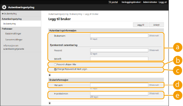 En bruker med «Administrator» som brukernavn er registrert som standard for brukeren med administratorrettigheter. Denne «Administrator» kan ikke slettes, men den kan deaktiveres etter å ha lagt til en annen bruker med «Administrator»-rettigheter. Hvis «Administrator»-brukeren er deaktivert, kan du ikke endre innstillinger som kun «Administrator»-brukeren kan konfigurere, på kontrollpanelet til maskinen.