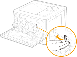 Innan du tar ut trumpatronen, kontrollera att den vänstra luckan har öppnats helt och hållet. Trumpatronen kan skadas om den dras ut när frontluckan inte är helt öppen.