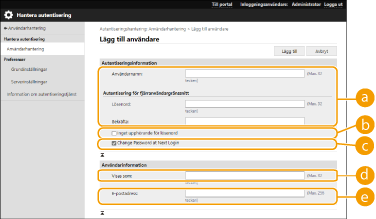 En användare med användarnamnet ”Administrator” är som standard registrerad som användare med administratörsbehörighet. Denna ”Administrator”-användare kan inte raderas, men den kan inaktiveras efter att ha lagt till ytterligare en användare med ”Administrator”-behörigheter. Om ”Administrator”-användaren är inaktiverad kan du inte ändra inställningar som endast ”Administrator”-användaren kan konfigurera på maskinens kontrollpanel.