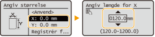 Angiv længden på <X>-siden og <Y>-siden. Vælg <X> eller <Y> for at angive længden på hver side med taltasterne eller