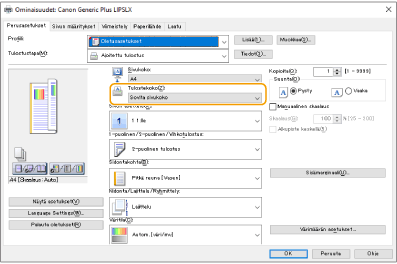 3 | Kun tarkistat tulostuksen esikatselun, määritä [Sivun asettelu] [Sivujärjestys] [1-puolinen/2-puolinen/Vihkotulostus] [Sidontakohta]. |