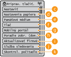 <Nastavenia funkcie>, <Predvoľby> a mnohé ďalšie nastavenia zariadenia sa začínajú týmto tlačidlom.