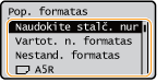 Jei dažnai reikia keisti įdedamo popieriaus formatą, nustatykite <Nestand. formatas>; taip sumažinsite kaskart keičiant parametrą atliekamų veiksmų skaičių. Be to, jeigu spausdintuvo tvarkyklėje nurodytas visiškai kitokio formato popierius, negu įdėtasis, gali būti rodomas klaidos pranešimas.