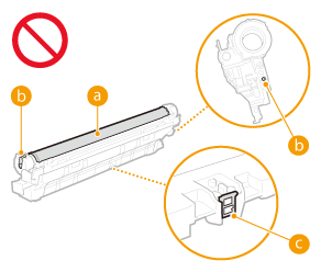 Jälgige, et hoiaksite trumlikassetti käepidemest. Ärge kriimustage trumli pinda (  ) ja kaitske seda valguse eest. Ärge puudutage elektrikontakte (  ) ega trumlikasseti mälu (  ). Ärge võtke trumlikassetti pakendist ega seadmest välja, kui see ei ole vajalik. |