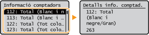 Podeu comprovar el nombre total de pàgines que s'han imprès. El nombre d'impressions inclou les impressions fetes des d'un dispositiu de memòria i la llista, així com les impressions de dades d'ordinadors.