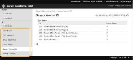 Hata bilgileri, kalan kağıt ve toner miktarı, takılı isteğe bağlı ekipmanlarla ilgili bilgi ve şimdiye kadar yazdırılan toplam sayfa sayısı gibi makine hakkındaki çeşitli bilgileri denetleyebilirsiniz.