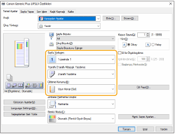 Baskı önizlemesini kontrol ederken [Sayfa Yerleşimi] [Sayfa Sırası] [1 taraflı/2 taraflı/Kitapçık Yazdırma] [Ciltleme Konumu] öğelerini ayarlayın.