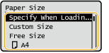 לאחר רישום הגדרת ברירת המחדל לנייר, מסך הגדרת הנייר לא יוצג בעת טעינת הנייר, וייעשה שימוש תמיד באותה ההגדרה. אם תטען נייר בגודל או מסוג אחר מבלי לשנות את הגדרות הנייר, ייתכן שהמכשיר לא יוכל להדפיס כראוי. כדי למנוע בעיה זו, בחר <Specify When Loading Paper> בשלב 3 ולאחר מכן טען את הנייר.