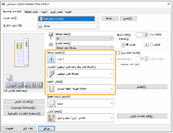 أثناء التحقق من معاينة الطباعة، قم بتعيين [تخطيط الصفحة] [ترتيب الصفحات] [طباعة على وجه واحد/على الوجهين/الكتيبات] [مكان التجليد].