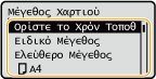 Αφού καταχωριστεί η προεπιλεγμένη ρύθμιση χαρτιού, η οθόνη ρύθμισης χαρτιού δεν εμφανίζεται όταν τοποθετείται το χαρτί, και χρησιμοποιείται πάντα η ίδια ρύθμιση. Εάν τοποθετήσετε διαφορετικό μέγεθος ή τύπο χαρτιού χωρίς να αλλάξετε τις ρυθμίσεις χαρτιού, η συσκευή ενδέχεται να μην εκτυπώνει σωστά. Για να αποφύγετε αυτό το πρόβλημα, επιλέξτε <Ορίστε το Χρόν Τοποθ Χαρτ> στο βήμα 3 και, στη συνέχεια, τοποθετήστε το χαρτί.