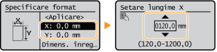 Specificaţi lungimea laturii <X> şi a laturii <Y>. Selectaţi <X> sau <Y> pentru a specifica lungimea fiecărei laturi utilizând tastele numerice sau