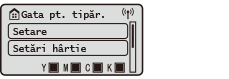 Aveţi posibilitatea să modificaţi setările referitoare la afişarea pe ecran, cum ar fi alegerea ecranului care apare imediat după pornirea aparatului sau dacă mesajul care se afişează se referă la volumul rămas de hârtie sau de toner. <Setări afişare>