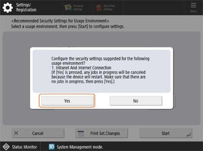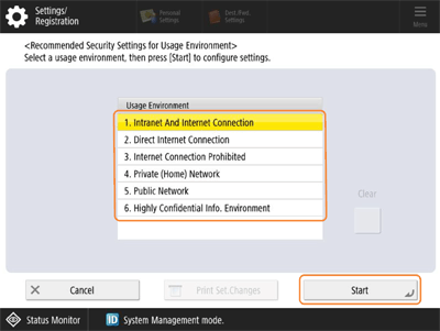 Press <Management Settings> → <Security Settings> → <Recommended Security Set. for Usage Environment>.