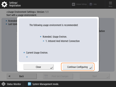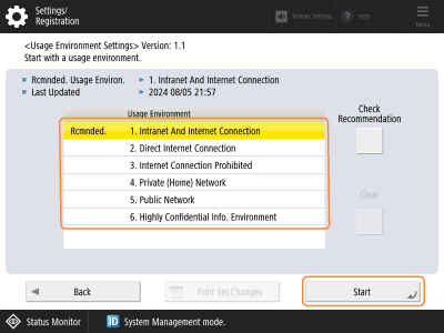 5If the security settings have already been changed by selecting the recommended environment type, the <Usage Environment Settings> screen is displayed. Step