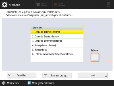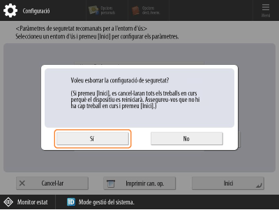 Si heu canviat manualment les opcions que s'havien canviat amb <Paràmetres de seguretat recom. per a l'entorn d'ús>, els canvis no es conservaran. L'equip torna a l'estat abans d'executar <Paràmetres de seguretat recom. per a l'entorn d'ús>.