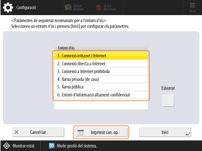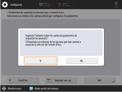 En aquest cas, la informació s'imprimirà correctament si canvieu les opcions de seguretat amb <Paràmetres de seguretat recom. per a l'entorn d'ús> de nou.