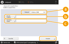 2 | Especifiqueu la carpeta d'inici i premeu <Bé>. ![]() <Protocol>Seleccioneu el protocol que cal utilitzar en accedir a les carpetes personals. <Nom de l'amfitrió>Introduïu el nom d'amfitrió o l'adreça IP de l'ordinador en què vulgueu crear la carpeta d'inici. <Camí de la carpeta>Introduïu el camí de la carpeta d'inici. Per exemple, introduïu "users\public\share" per a una carpeta d'inici creada dins d'una carpeta anomenada "share" a la carpeta "Public" de la unitat C: (camí: "C:\users\public\share"). ![]() Pot ser que no pugueu especificar el camí si hi ha massa nivells de carpetes. |